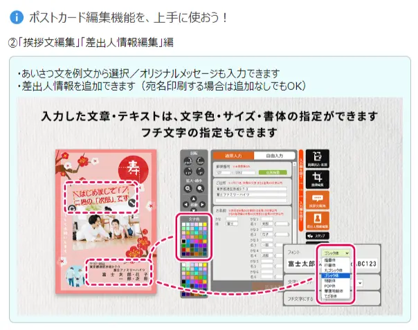 フォントや文字の色、サイズの変更、例文から文章を選ぶこともできます。