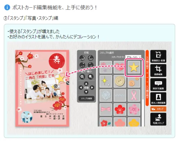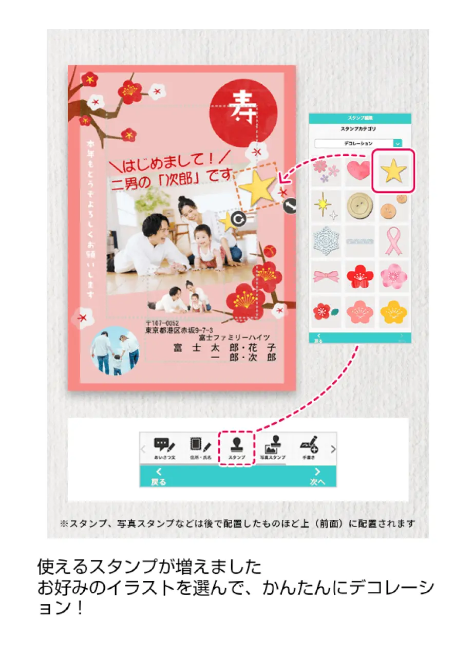 ⑤スタンプ…305個のスタンプからお好みのものを選び、自由に配置をして、デザインをアレンジすることができます。