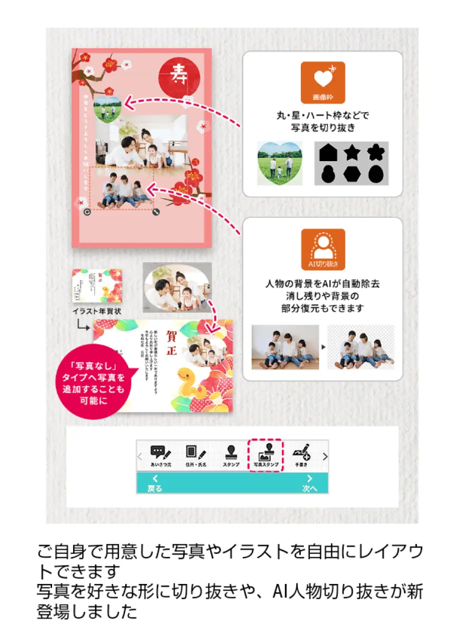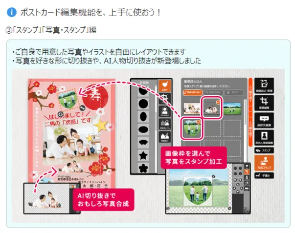 ⑥写真スタンプ…お持ちの画像をAI切り抜きや好きな形に切り抜きし、スタンプのように自由に配置することができます。