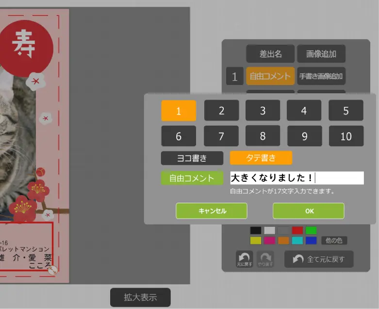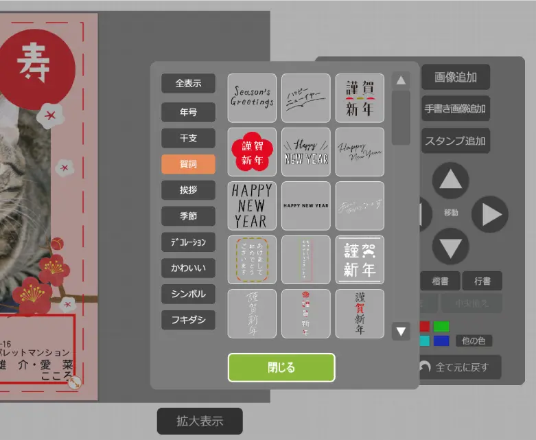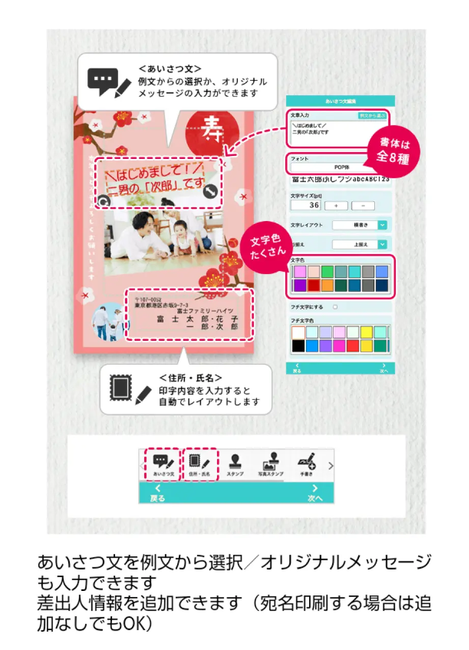 ③挨拶文編集…文章を入力・配置できます。