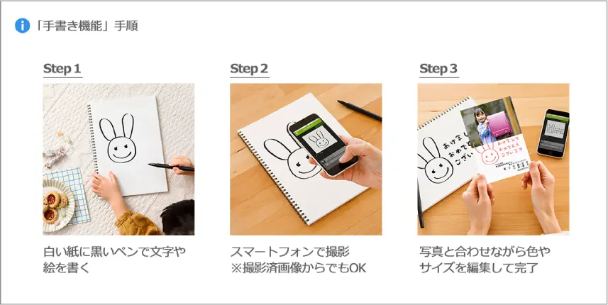 ⑦手書き…白い紙に黒いペンで文字や絵を書いた画像を自動で切り抜きし、スタンプのように自由に配置することができます。